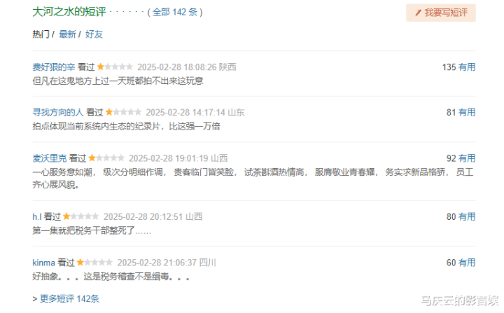 2月28日晚间,电视剧《大河之水》正式首播。老编我看完了首播之后,没有写剧评看法。因为我不太了解税务人员们的工作,虽然我也有同学在这个相关部门工作,但我总不能因为自己要写剧评,就去询问人家真正在这个部门工作的人员吧。所以,我等到3月1日,才写剧评。这一段等待,其实是等待观众们的真实看法。